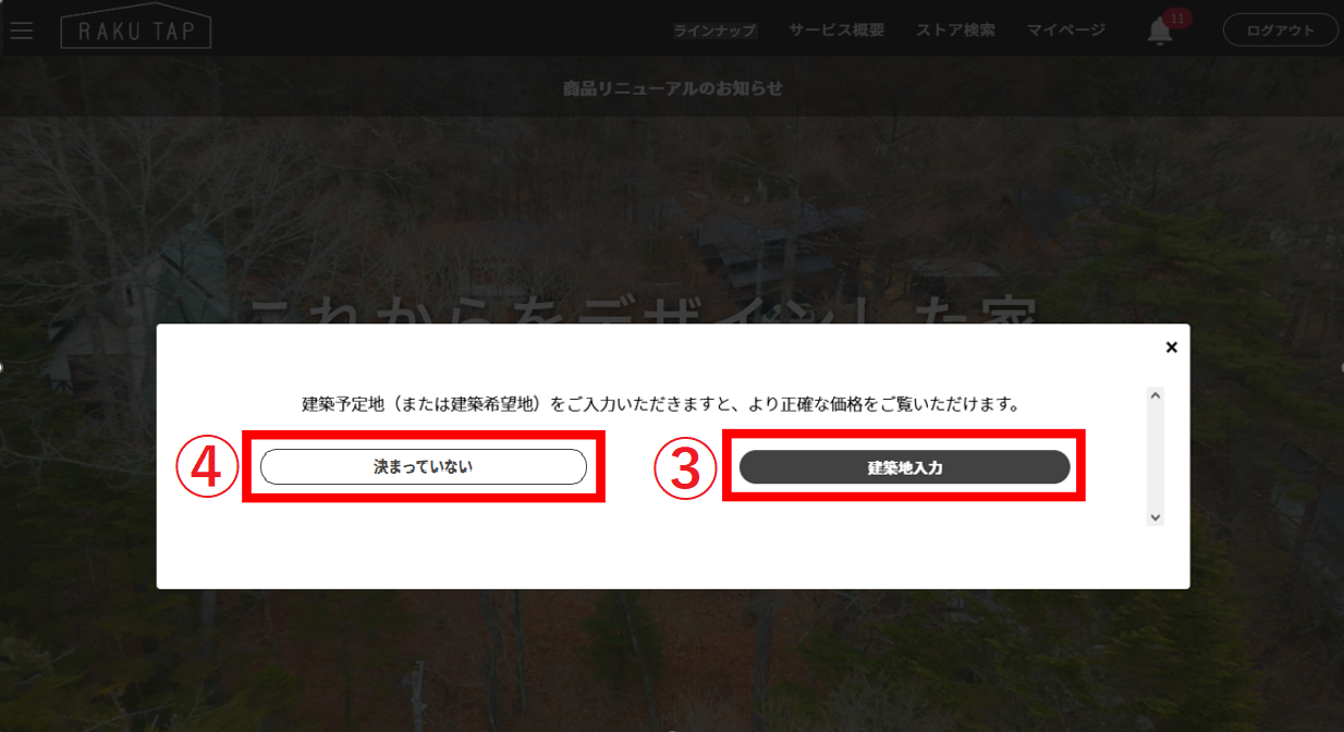 - ラインナップでお好みの住宅プランをクリックすると、建築予定地(または建築希望地)入力のためのポップアップが開きます。