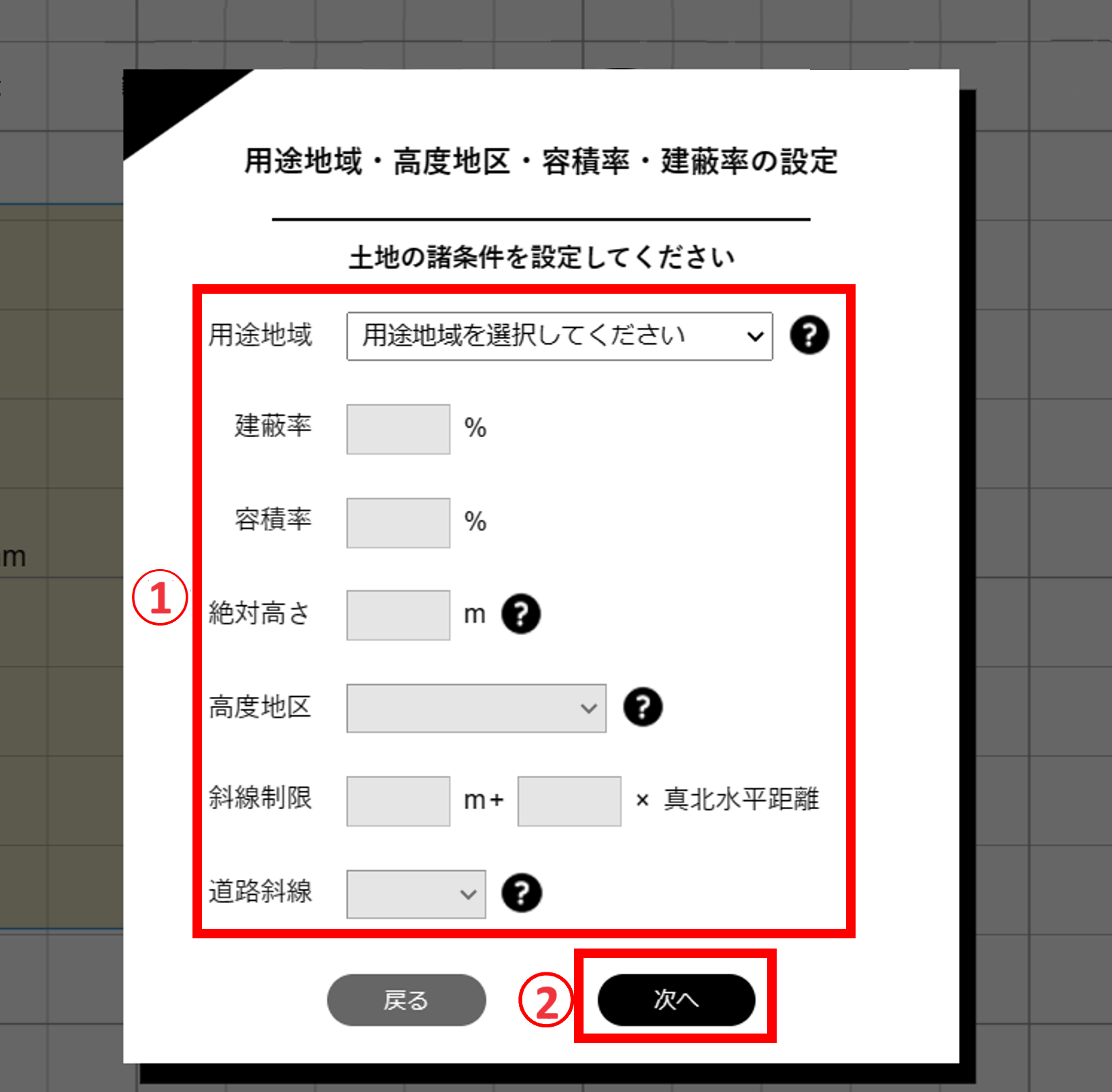 - ※「用途地域」を選択されますと、デフォルトの数値が入力されます。実際の建築地の数値がデフォルト値と異なる場合は、正しい数値に修正してください。